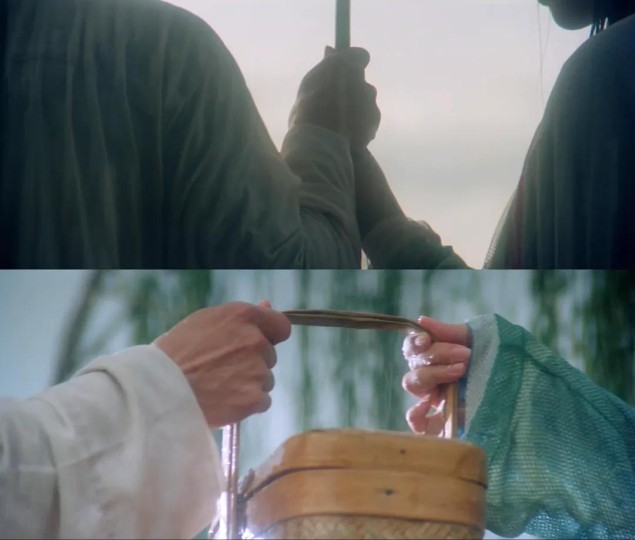 请注意以下两个“互相拉扯”的对位画面:它们一个来自初见白蛇,一个来自初见青蛇,象征许仙内心对情感的贪婪。自此往后,这个“老实人”就一直在两个女人间摇摆周旋,所幸他没遇见第三个,否则,一样的。