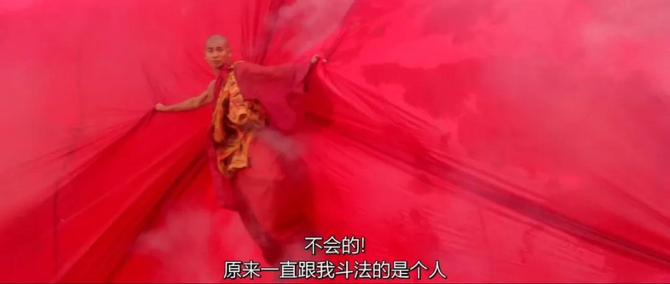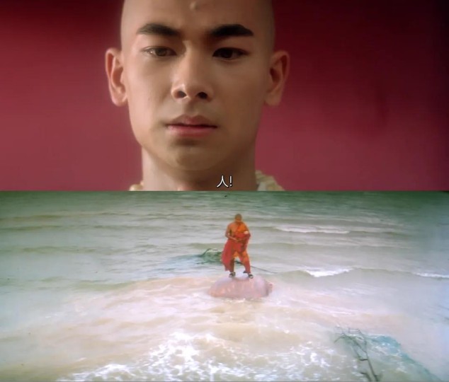厌恶人类且不容于世的法海需要平静。镜头蓦地一转,“火烧火燎”的人类世界消失,云山雾绕间,法海孤立于水面之上,脚下涟漪重重,“高人”的内心何其孤独。