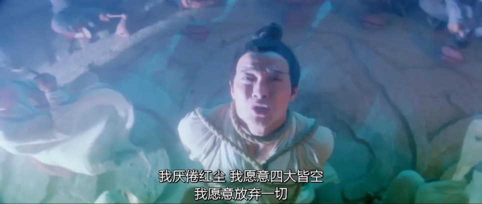影片最后,“回归凡人”的法海抱着白素贞的孩子。耳边,是婴儿初识世间的凄恻哭声;眼前,是一片被洗刷干净、白茫茫的大地。水泽之上,孤立木鱼的法海终于体会到了极致的孤独: