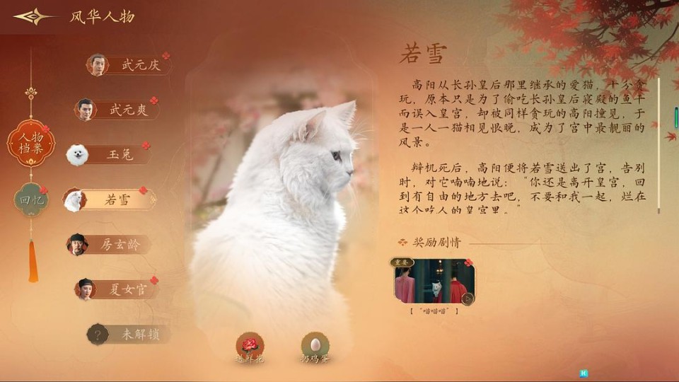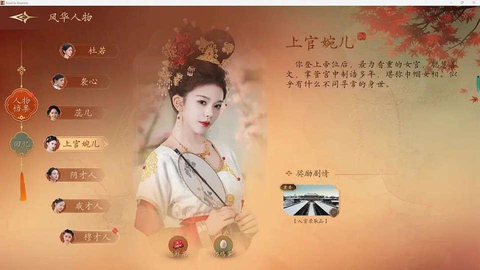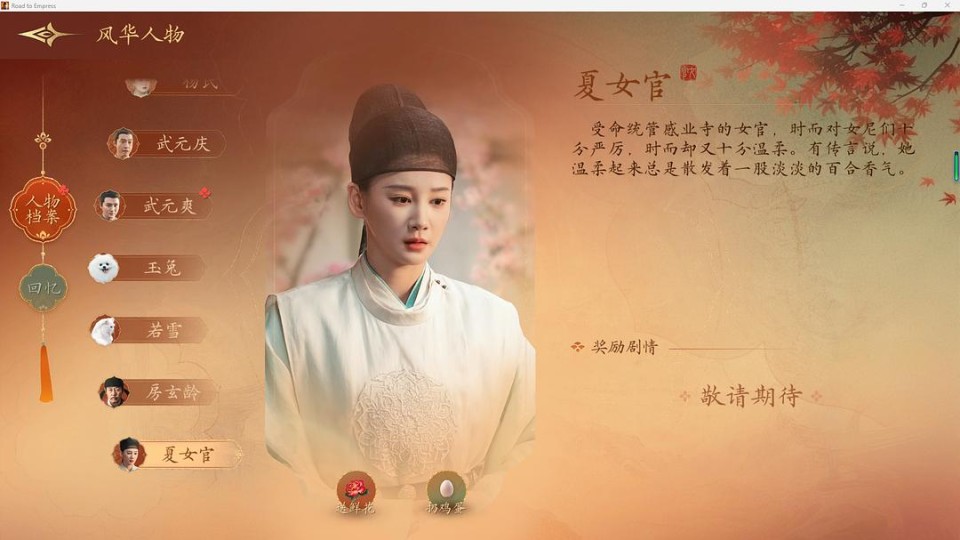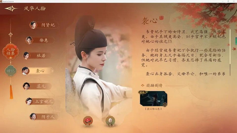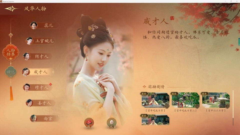 4,”风华人物“,本作的叫法,其实就是常规的档案室,资料馆,里面是真的有人物档案的,另外附加各种隐藏剧情,里面还有一个叫”回忆“的功能也是放各种隐藏剧情的,至于具体感受就正如我上面第三点说的一样,关于档案功能,按照惯例我后面会再展开来说的。