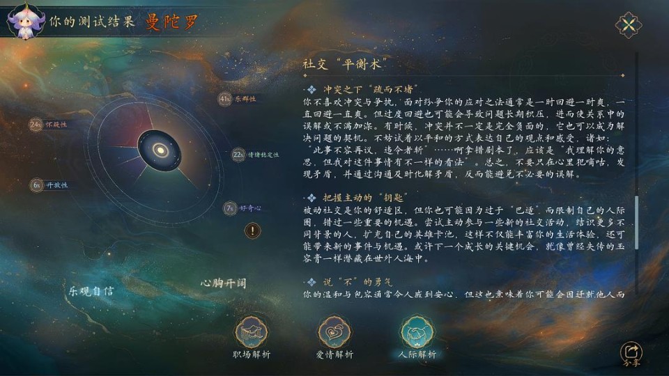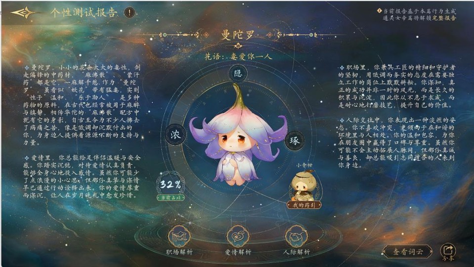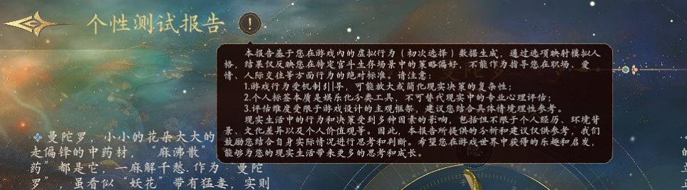 2,个性测试报告(心理测验),这个绝对是一个创新的功能,很有创意,我觉得以后的影游都可以学习一下,而且是唯一一个没办法做全收集的领域,毕竟只有一次,具体玩法和根据看图吧,我不解释那么多了。