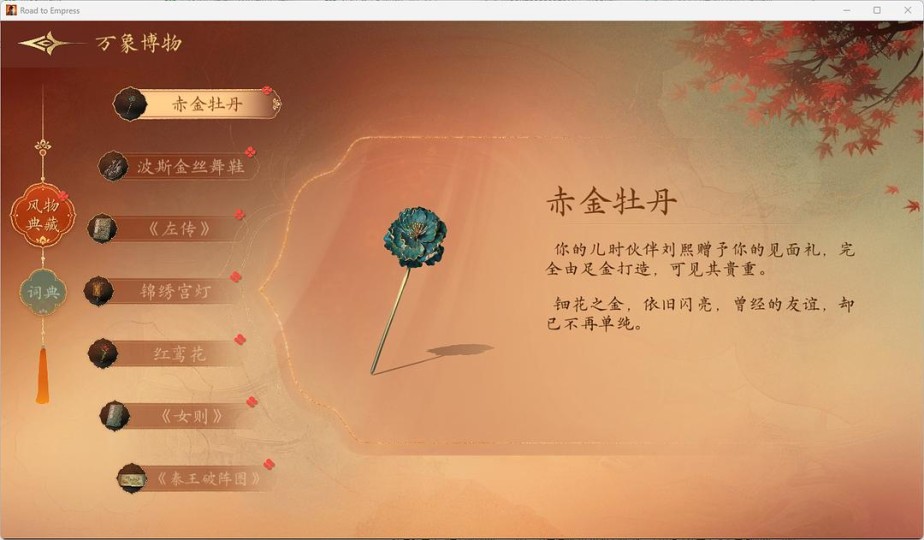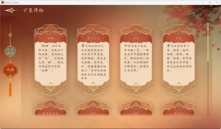 5,”万象博物“,这是一个属于物品手机,道具栏的功能,但是本作通关是不需要使用任何道具的,所以这是一个纯收集向的功能,其主要作用是起到科普效果,挺好的,里头除了物品的科普还带古代宫廷里头部分官职的科普,然后”万象博物“和”风华人物”都是采用跟《伐定天下》里面的科普功能差不多的橙色基调,上图: