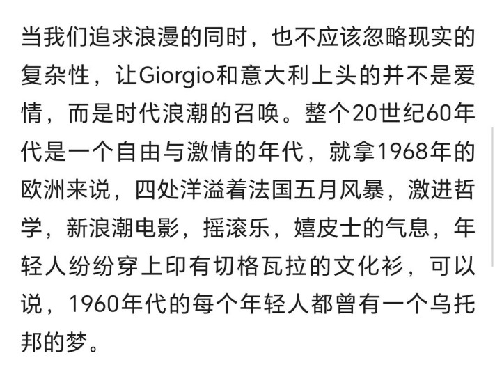 还有欧洲事务协会,专门协调国家之间的关系,不针对个人。所以如果想去申请帮助,得先成为正式国家,都得到其他国家的承认。可是他正是因为无法得到承认才去寻求帮助的呀。 几个成员之间的矛盾。理想主义与投机主义,无政府主义和纯自由精神,还有混沌的流浪者,观念思想之间的冲突。乌托邦建立容易,长期维持下去很难。人的理想往往越纯粹越想脱离现实矛盾,反而越容易遇到各种矛盾。 就像我厌倦了虚伪肤浅的人际关系内卷疲惫的生活模式,曾经很向往找个农村大院自己设计打造一个花园,过过单纯的田园生活。别人就告诉我说,农村的人际关系一点都不简单,又欺生又排外,更擅长扯舌头传八卦,还有卫生,不会是你想要的生活环境。我听了些张三李四来分享的实例,还看了个日本年轻人从都市辞职去乡村生活后来被各种现实矛盾(主要是人事和村政)打败而返城的记录片,发现自己过于理想化了。 人人都向往的那种绝对自由,无拘无束没有腐败没有黑暗的乌托邦根本是不存在的。几个人都会有矛盾,人再多了就更加难以稳定持续。 另:男主罗萨自己造一辆汽车无证驾驶无牌上路,自己造一架飞行器无证驾驶无照上天,实在也是🐄🖊。 画面很美,海景尤其美;片尾曲也很好听。