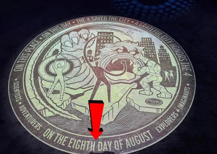 四人站立在纪念巨怪之战的圆形地碑上,碑文"8月8日"正是《神奇四侠》创刊号出版日期1961年8月8日。