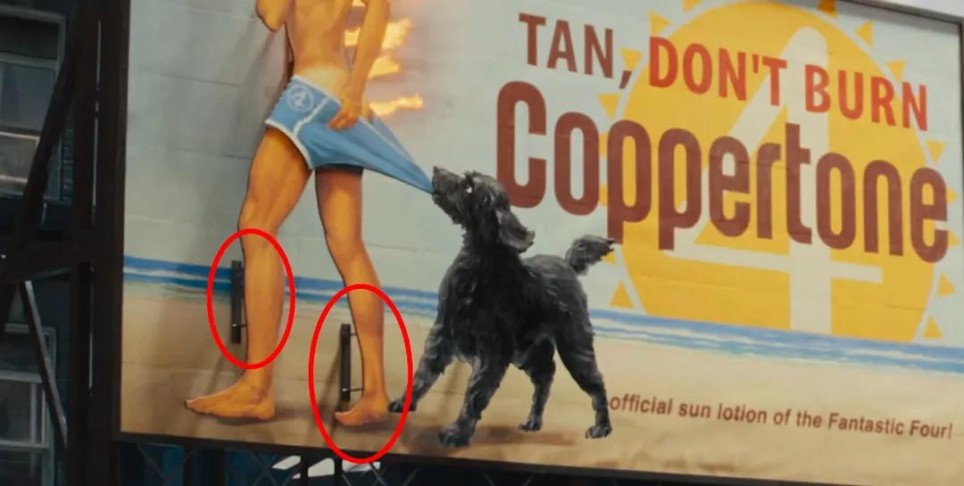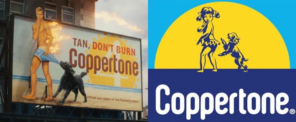Coppertone是现实中的防晒品牌"水宝宝",经典的太阳标志被加入了数字"4"的设计,女孩变为了霹雳火,下面写着"神奇四侠官方指定防晒霜"。