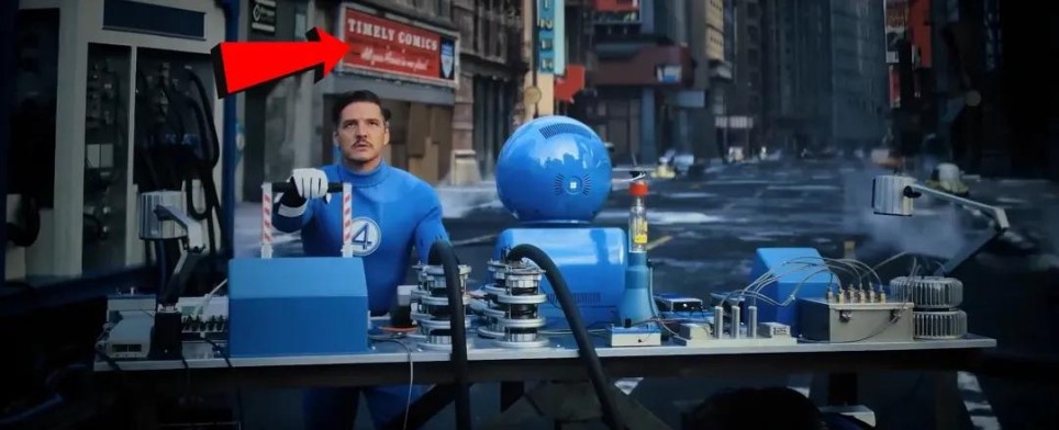 地碑上镌刻的巨怪之战场景,既还原了电影中四侠与巨怪的对决,又复刻了《神奇四侠》创刊号封面设计。