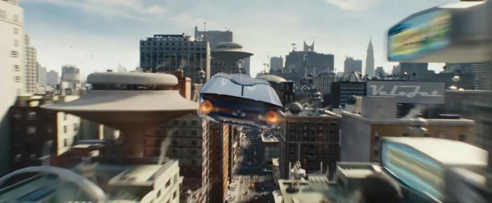 车辆腾空而起时,背景里牵着斑点狗散步的飞行机器人,彰显着这个复古未来世界的设定。