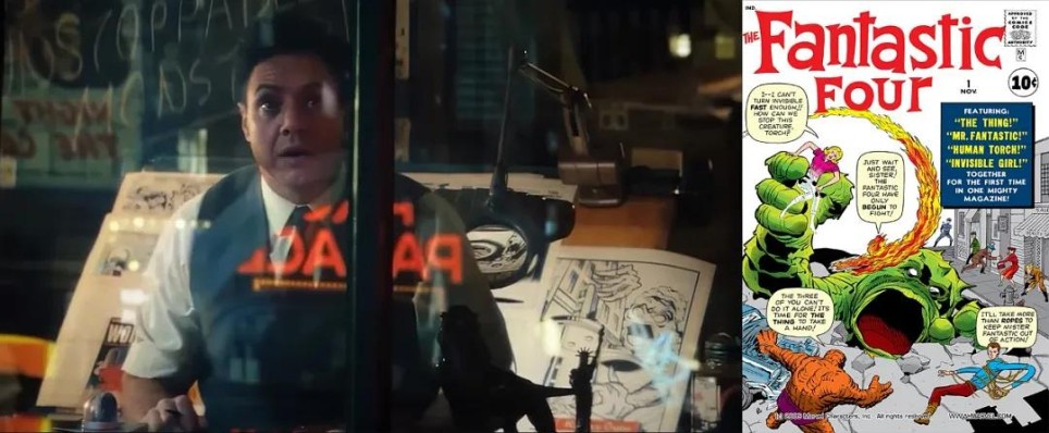 当四侠与"巨怪"交战时,画面完美复刻了1961年《神奇四侠》第1期封面构图。