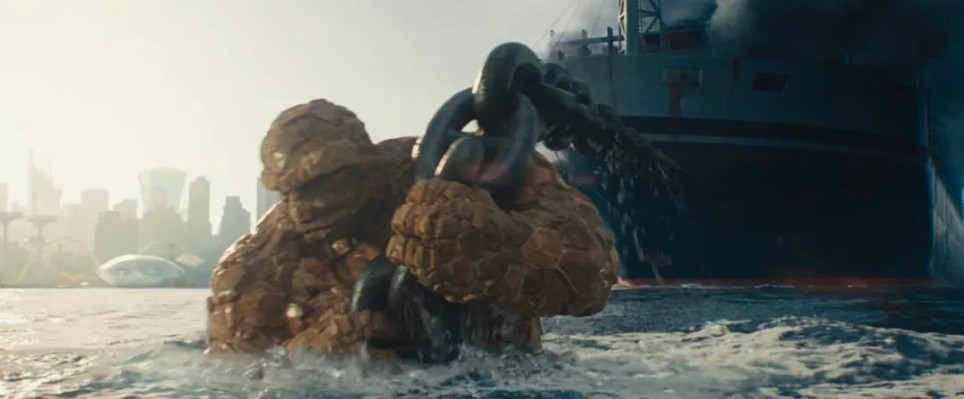 开场蒙太奇石头人拖曳船只靠岸的镜头,让人联想到《蝙蝠侠大战超人》的经典场景。