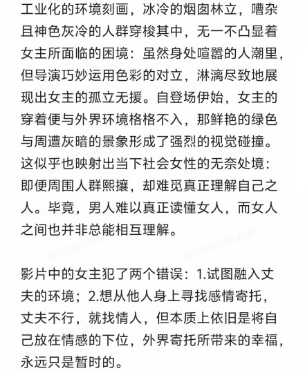 女主朱莉·安娜,她神经质、焦虑、缺乏安全感,从她丈夫与外人的交谈中得知,女主曾经遇过车祸,虽身体无大碍,但脑部受到了震荡,丈夫轻描淡写的口气好像事不关己,充斥着冷漠与自私。女主的存在与周围的世界格格不入。蓝色,冰冷、抑郁、疏离;白色,虚无、困惑、寂寞,房间中色彩的渲染大量采用蓝色与白色的交织,放大了不安和孤独,她与丈夫乌戈的感情,同工业区的废墟一样,呈现一种破败的状态。