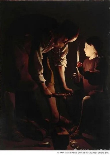 影片中,炉火永远是“光明的中心”。塔尔贝拉用特写镜头反复拍摄炉火:火焰在炉膛里跳动,照亮周围的柴火,也照亮父女的手——他们往炉里添柴时,手指在火光中显得粗糙而有力;他们围坐炉边吃土豆时,脸的一半在光明里,一半在阴影里。这正是塔尔借鉴了德・拉・图尔的油画《木匠圣约瑟夫》。而炉火照不到的地方,永远是深暗的:木屋的角落、门口的走廊、窗外的荒原,都隐在黑暗中,只有偶尔的风声提醒我们“外部世界”的存在。